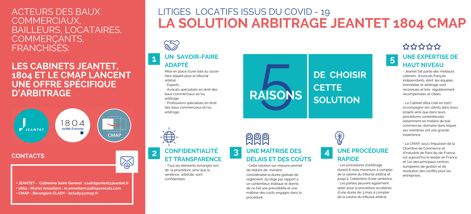 « Le cabinet 1804 est, depuis de nombreuses années maintenant, un observateur et un acteur de l’évolution du marché de l’immobilier commercial. Dès le 16 mars dernier nous avons fait le constat qu’aucun système n’existait à ce jour pour solutionner rapidement et à un coût maitrisé ces contentieux naissants, de masse. Ce constat a été partagé avec le Cabinet Jeantet. Travailler avec la CMAP afin de proposer une offre sur mesure a été une évidence.», ajoute pour sa part Muriel Amsellem, Associée du Cabinet 1804.
