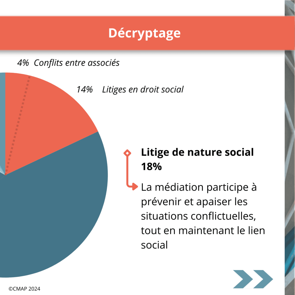 🔹 18 % litige de nature sociale : Principalement des conflits du travail (14 %) et des désaccords entre associés (4 %).